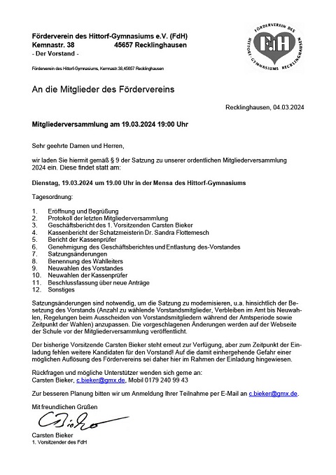 Der Förderverein lädt zur Mitgliederversammlung am 19.03.2024 um 19:00 Uhr in die Mensa des Hittorf-Gymnasiums ein.
