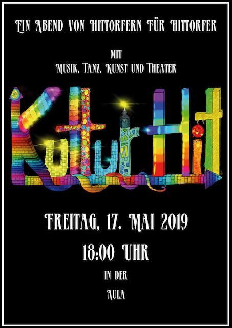 Am Freitag, dem 17. Mai 2019 findet um 18 Uhr der Kultur-Hitt bei uns am Hittorf-Gymnasium statt. Der Abend ist in mehrere Stationen gegliedert und findet daher in der Mensa, dem Glaskasten und der Turnhalle statt. Die Idee des Abends ist es, Musik, Theater, Tanz und der bildenden Kunst des Hittorfs eine Bühne zu bieten.