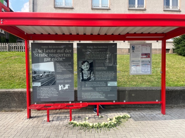 An der Haltestelle fällt besonders das Bild Günther Arons auf, dem jüngsten Bewohner eines Recklinghäuser „Ghettohauses“. Günther Aron verlor im Alter von fünf Jahren sein Zuhause. Er wurde zuerst nach Riga verschleppt und 1943 von den Nationalsozialisten in Auschwitz ermordet.