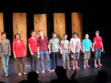 Im Rahmen der Lese-AG entstand die Idee, doch auch einmal gemeinsam ins Theater zu gehen. Am 14.5.2013 besuchte Frau Dieterle-Terjung mit neun Schülern des Jahrgangs 6 das Stück "Neun Leben", das speziell für Jugendliche im Rahmen der Ruhrfestspiele im Fringezelt angeboten wurde. Die Neugier auf das Stück war groß. Das Junge Ensemble Stuttgart stellte mit Musik und Tanz eindrucksvoll die Situation heranwachsender Jugendlicher dar. Immer wieder werden Kräfte gemessen, Platz- und Hierarchiekämpfe ausgetragen - die ungeheure Energie, die von den Jungen ausgeht, wird ausdrucksstark inszeniert. Nach der 70minütigen Vorführung waren alle Besucher sehr beeindruckt, was sich in begeistertem Applaus niederschlug.