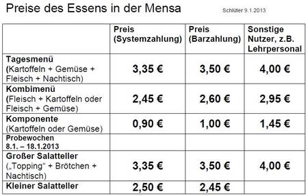 Zum 1.1.2013 sind die Preise an das Komponentenessen angepasst worden: