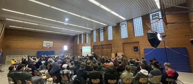 "Man konnte eine Nadel fallen hören" bemerkte Lutz Kliche, Verleger und Literaturvermittler, der den Vortrag der Holocaust-Überlebenden Ruth Weiss begleitete. 140 Schülerinnen und Schüler der Oberstufe lauschten gebannt dem Vortrag der 94-jährigen Dame, die vom Grauen des Nationalsozialismus in den Apartheids-Staat Südafrika floh und sich erneut mit Diskriminierung und Ausgrenzung konfrontiert sah. Ihre abschließenden Worte an die Schülerinnen und Schüler sollten lange nachhallen: "...dass sich diese Dinge nicht wiederholen, dass die Gesellschaft sich immer wieder engagiert... dafür seid ihr verantwortlich"