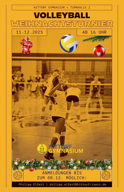 Es wird wieder festlich – und richtig sportlich! Schnürt eure Sportschuhe, packt eure Nikolausmützen ein und macht euch bereit für das traditionelle Volleyball-Weihnachtsturnier am Hittorf-Gymnasium am 11.12.2025.