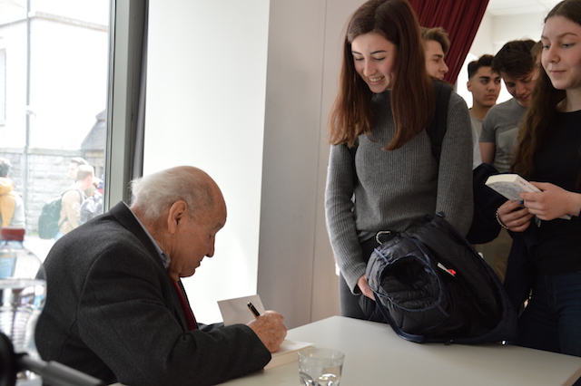 Bereitwillig beantwortete Herr Perel die Fragen der Schülerinnen und Schüler, signierte seine Bücher und stand für Selfies bereit. Denn heute ist es für ihn besonders die Wahrheit, die zählt. Der Holocaust darf unter keinen Umständen verschwiegen oder gar zur Lüge erklärt werden: „Wer die Wahrheit nicht kennt, ist bloß ein Schwachkopf. Doch wer sie kennt, sie jedoch eine Lüge nennt, ist ein Verbrecher“. Deshalb gab er den Schülerinnen und Schülern mit auf den Weg, seine Geschichte weiterzuerzählen als nächste Generation von Zeitzeugen, die einen der letzten Zeitzeugen des Holocaust aus erster Hand erleben konnten.