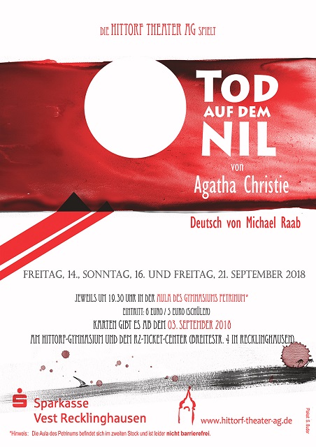 Der Vorverkauf für die neue Inszenierung „Tod auf dem Nil“ der Hittorf Theater AG hat begonnen. Der Klassiker von Agatha Christie wird am 14., 16. und 21. September, um jeweils 19:30 Uhr in der Aula am Petrinum gezeigt.