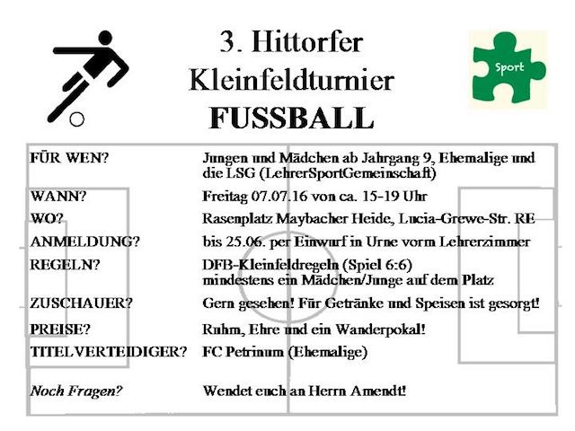 Am 7. Juli 2017 findet schon fast traditionell am vorletzten Freitag des Schuljahres das Kleinfeldturnier Fußball des Hittorf-Gymnasiums statt. Fußballbegeisterte der Jahrgangsstufen 9 bis Q2, Ehemalige sowie die LehrerSportGemeinschaft werden auf dem Kunstrasenplatz der Sportanlage Maybacher Heide (Lucia-Grewe.Str. 10) um den Wanderpokal spielen. Während sich bei der Erstauflage 2015 die Lehrer (LSG) den Titel sicherten, schaffte es im vergangenen Jahr eine Ehemaligenmannschaft (FC Petrinum). Einzige Auflage, die die selbst zusammengestellten Mannschaften erfüllen müssen, ist die Teilnahme von mindestens einem Jungen/Mann und einem Mädchen/Frau im Spiel 7:7. Spannende Spiele und knappe Ergebnisse gab es im vergangenen Jahr nicht nur in den Finalspielen, und auch jetzt haben sich einige Mannschaften bereits selbst zum Titelfavoriten ernannt. Wir freuen uns über jegliche Unterstützung auch von den unteren Jahrgängen, Familienangehörigen oder Freunden und hoffen auf bestes Fußballwetter, um bei kühlen Getränken und leckerem Grillgut wieder ein tolles gemeinschaftliches Turnier austragen zu können. Das Anmeldeformular gibt es hier.