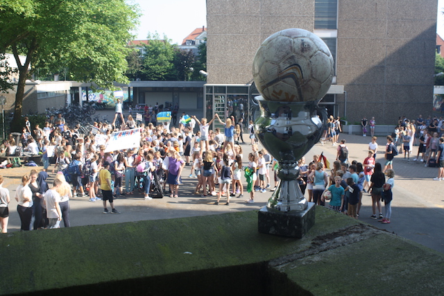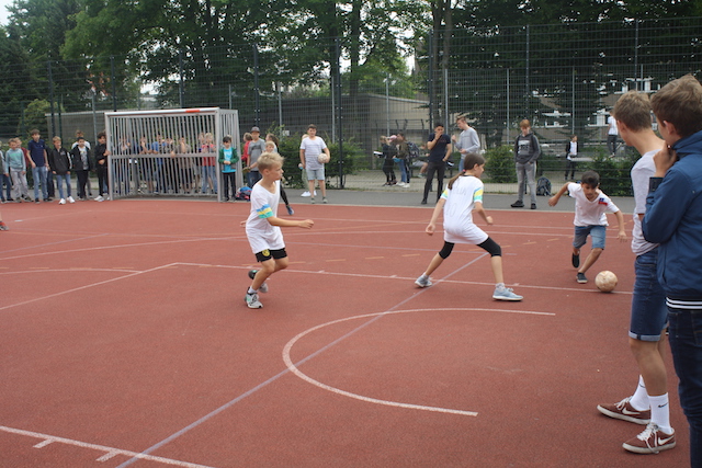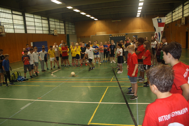Es waren drei intensive Wochen am Hittorf-Gymnasium. Die Straßenfußball-WM mit der besonderen kickFAIR-Spielweise sorgte für viel Gesprächsstoff und spannende Spiele mit wahlweise großer Freude, Enttäuschung oder einfach Begeisterung. In den zweiten großen Pausen sowie den Mittagspausen sorgten die Jahrgänge 5 und 6 mit selbst gestalteten Trikots, Fahnen, Plakaten und sogar einer blinkenden und Töne erzeugenden Anfeuerungstafel der 6a für ein tolles Fußballfest. Zwar wurde der ein oder andere Unterrichtsverlauf gestört, doch die emotionalen Diskussionen, die die Vergabe der Regelpunkte begleitet, sorgten für eine wertvolle Auseinandersetzung mit der Bedeutung von Regeln sowie fairem Verhalten. Dass dies ein langwieriger und manchmal schwieriger Prozess ist, wurde an vielen Stellen deutlich. Dennoch sorgten die vereinbarten Regeln für meist faire, freudige und gemeinschaftliche Spiele - so wurde bei verschiedenen Torhütern nicht gebolzt, gegnerische Tore wurden bejubelt, es wurde getanzt, wenn man einen Gegenspieler getunnelt hatte und nach dem Spiel mit den Gegnern abgeklatscht.