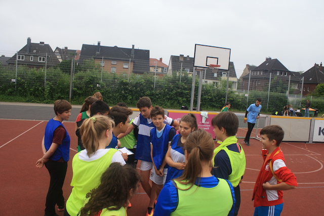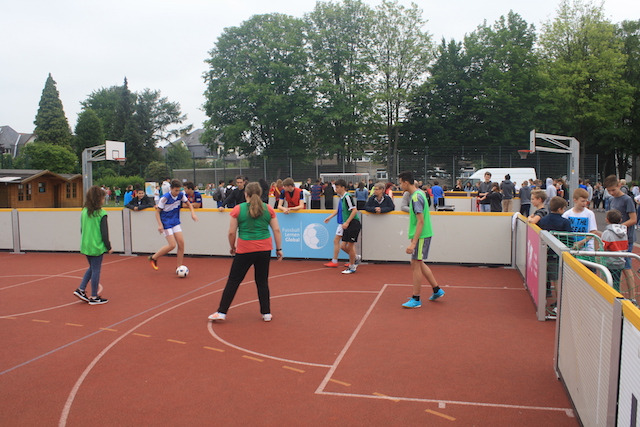 Fünf Schulen, gemischte Teams, spannende Spiele und viel Freude – das war die vierte kickFAIR-Meisterschaft, die erneut am Hittorf durchgeführt wurde. Anfängliche Probleme mit dem Zusammenbau der zwei Bandensysteme wurden spontan in eine KICKFAIR-typische Gemeinschaftsaktion umfunktioniert. Der gemeinsame Start setzte sich im Bilden von Mannschaften, Finden von eigenen Mannschaftsnamen und dem Einigen auf für das Turnier geltende Spielregeln fort. Von Beginn an lief es so in den Teams, die zufällig aus Jungen und Mädchen der verschiedenen Schularten gebildet wurden, problemlos. Geleitet wurden die Spiele von ausgebildeten Teamern, die ebenfalls von drei beteiligten Schulen stammten.
