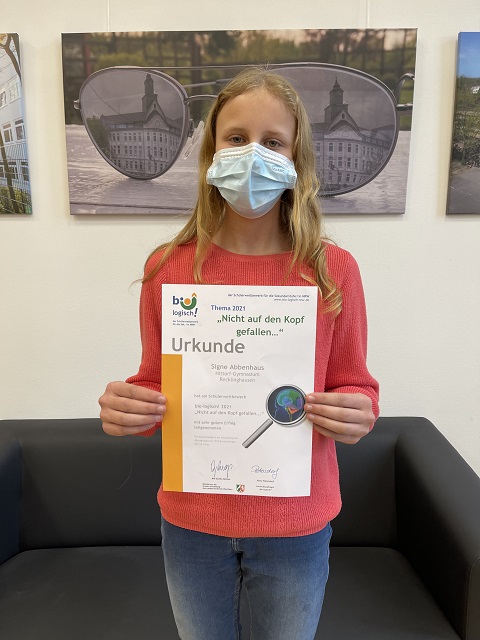 Die Hittorferin besucht die 7. Klasse an unserer Schule und hat sich, da es in Klasse 7 keinen regulären Biologieunterricht gibt, aus großem Interesse einfach selbst für den Wettbewerb bio-logisch angemeldet. Dabei schnitt Signe allerdings so gut ab, dass sie anschließend mit den Jahrgangsbesten zu einer viertägigen Schülerakademie eingeladen wurde.
