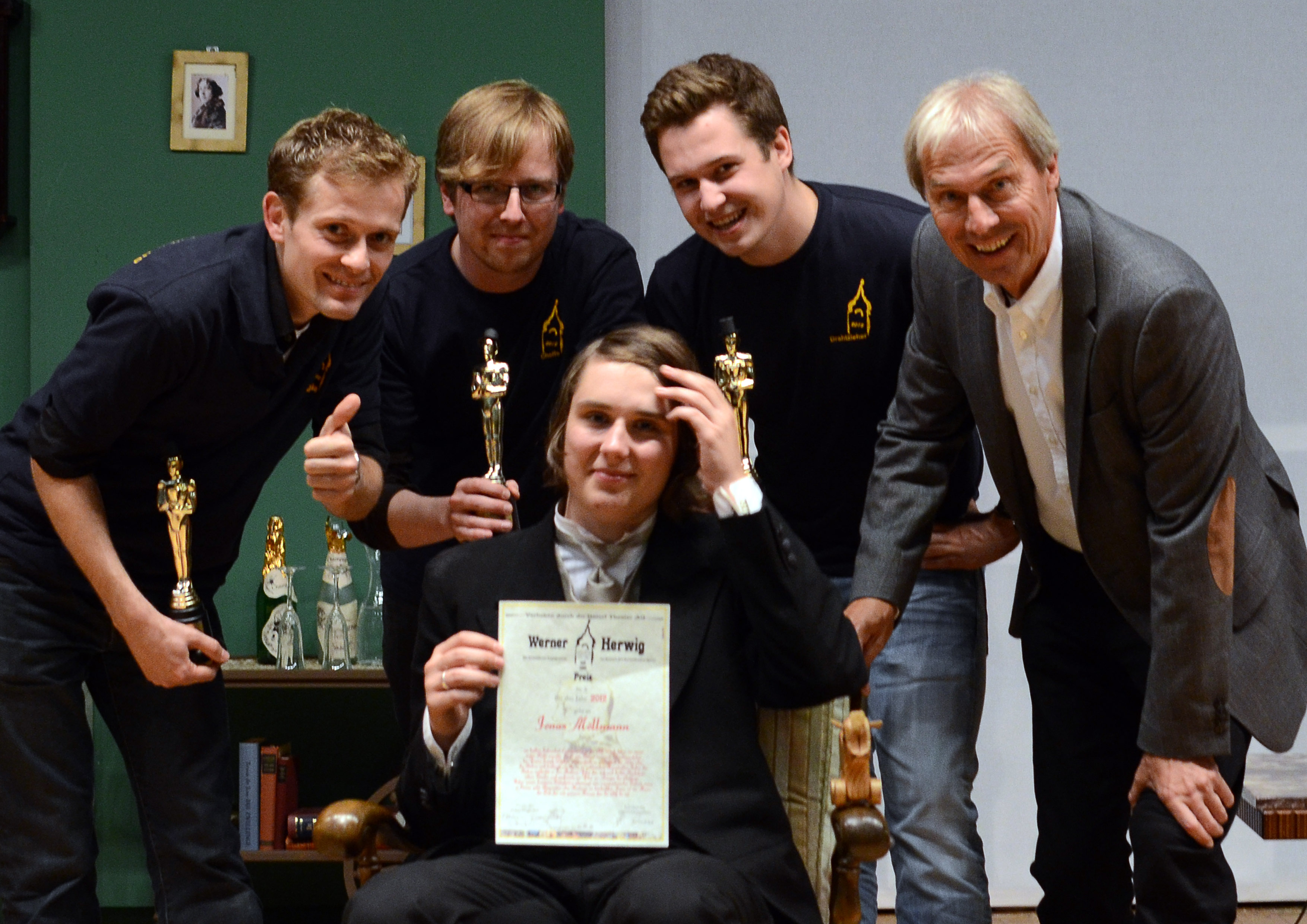 Einen würdigen Rahmen erhielt die Preisverleihung nicht zuletzt dadurch, dass die letzte Aufführung in diesem Jahr ausverkauft war. Neben Jonas Möllmann wurden auch noch Harri Gellert, Sebastian Buder und Fabian Kleinherne als AG-Leiter für ihren Einsatz vom Essemble ausgezeichnet. Harri Gellert betonte in seiner Dankesrede besonders das angenehmen Arbeitsklima innerhalb der Theatergruppe, das einen nicht unerheblichen Einfluss auf die gelungenen Vorstellungen gehabt habe. Auch die Ehefrau des verstorbenen Werner Herwig lobte die Theater-AG und spendete 250,- Euro als Sonderpreis.