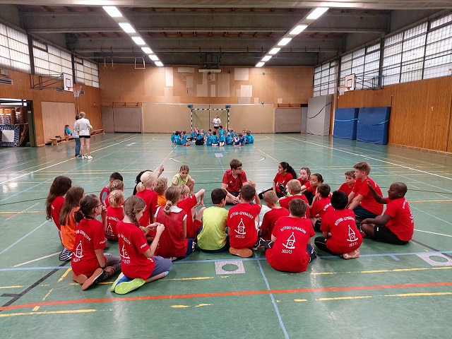 Nach Jahren des Wartens konnten die 5ten Klassen endlich wieder mit einem Straßenfußballturnier am Hittorf begrüßt werden. Die von KICKFAIR e.V. und den erfahrenen Mitgliedern der Hittorfer kickFAIR-AG ausgebildeten Teamer der 9. und 10. Klassen organisierten dabei eine Turnierform für den gesamten fünften Jahrgang. Aufgrund des Regens fanden die Spiele in den beiden großen Turnhallen statt und sorgten für eine ausgelassene, lautstarke und freudige Atmosphäre. Beim ersten Durchgang merkte man den Neuankömmlingen an, dass ihnen die kickFAIR-Spielweise noch fremd ist. Gewinnen um jeden Preis stand bei einigen im Vordergrund, Foulspiele wurden ignoriert und beim Wechseln gab es immer wieder Uneinigkeiten. Auch das Jubeln für den Gegner war erstmal sehr gewöhnungsbedürftig. Doch die weiteren Partien zeigten, dass kickFAIR für Respekt, Fairplay und Teamarbeit steht und die gemeinsam erstellten Regeln genau das fördern können.
