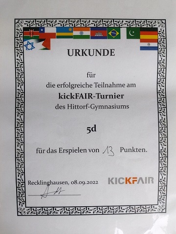 Während vor dem Spiel gemeinsam Regeln festgelegt werden, wird deren Einhaltung am Ende des Spiels gemeinsam bewertet. Und schon das erste Spiel zwischen der 5c und der 5d verdeutlichte dann, warum bei kickFAIR faires Verhalten genauso viel zählt wie das Erzielen von Toren. Denn obwohl die 5d nach Toren verloren hatte, sorgten sie durch die Regelpunkte für einen Endstand von 3:3. Dass dies zu teils emotionalen Diskussionen führte, ist dabei ein nötiger Nebeneffekt, aus dem viele Lerngelegenheiten entstehen. Dank der umsichtigen, rücksichtsvollen und aufmerksamen Mitwirkung der Teamer konnten die Neu-Hittorfer dadurch einen Schritt zu einem anderen Spielverständnis entwickeln. Viele Kinder kennen leider aus ihren Vereinen, dass ähnlich wie im Profisport nur das Ergebnis zählt und dieses mit allen Mitteln erreicht werden muss. Die kickFAIR-Spielweise dagegen hat zum Ziel, dass alle mit Freude dabei sein können - und trotzdem am Ende die beste Mannschaft gewinnen soll - aber eben auf faire Art und Weise.