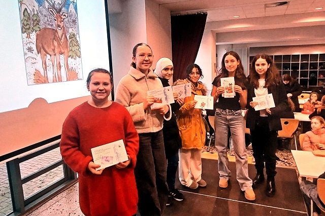 Am 05. Dezember war es wieder soweit, die Gewinnerinnen des 10. Hittorfer Postkartenwettbewerbs wurden gekührt. Auch wenn die Beteiligung mit gerade mal 23 eingereichten Karten gerne höher hätte ausfallen können, waren die Ergebnisse doch so toll, dass eine endgültige Entscheidung nicht leicht gefallen ist. Eine Jury, bestehend aus 3 Lehrerinnen und den Sekretärinnen, hat sich am Ende dann auf 6 Motive geeinigt, die bereits als Postkarten gedruckt wurden und am Tag der offenen Tür verkauft werden. Es wird bestimmt auch noch einen Verkaufsstand in der einen oder anderen Pause geben, wo sich alle interessierten Schülerinnen und Schüler ihr Material für die bevorstehende Weihnachtspost besorgen können. Vielen Dank an alle, die an dem Wettbewerb mitgemacht haben!