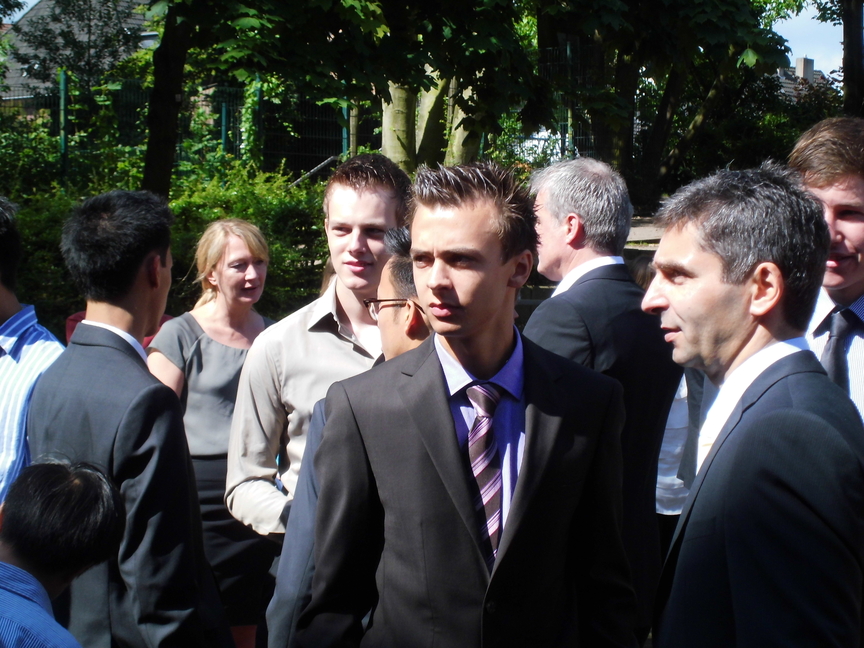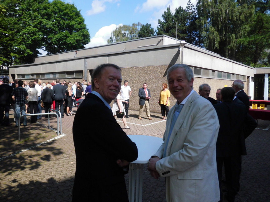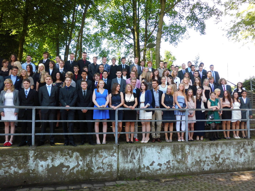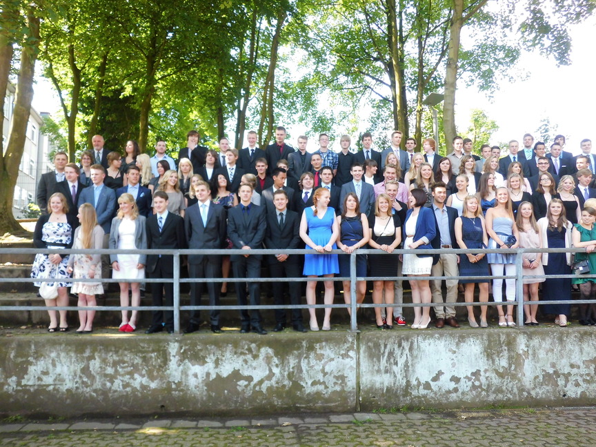 Bei strahlendem Sonnenschein nahmen am 30. Juni die 93 Abiturientinnen und Abiturienten des Hittorf-Gymnasiums ihre Reifezeugnisse entgegen, nicht weiniger als 34 von ihnen mit einer eins vor dem Komma. Besonders hervorzuheben sind in diesem Zusammenhang die Schüler Leon Roschig, der einen Jahrgang übersprungen hatte, und Fides Kramwinkel, die beide einen Notendurchschnitt von 1,0 haben. Die Schülerinnen Vanessa Rinus und Pia Händel haben ihr Abitur mit einem Notendurchschnitt von 1,1 abgeschlossen. Sie alle erhielten einen Geldpreis vom Verein der Ehemaligen.