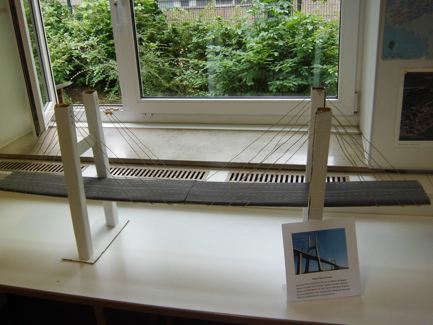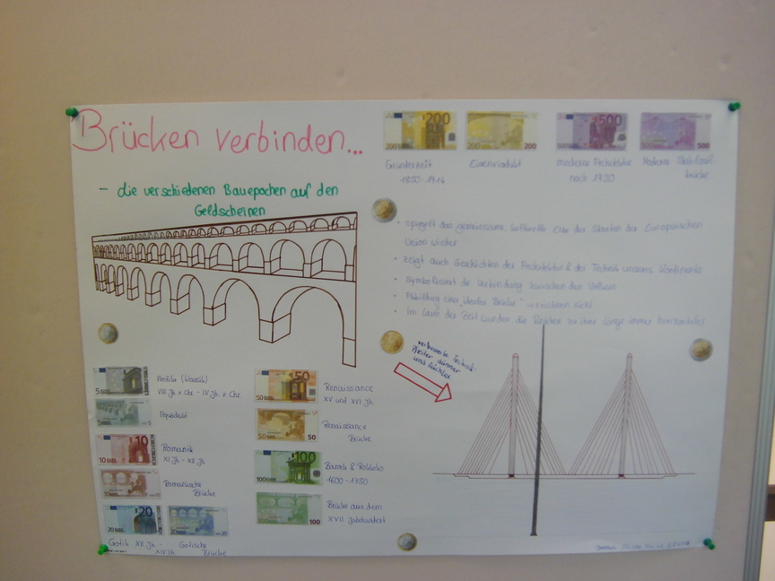 - Die Klassen 9e, 9c und 9d haben sich zusammen mit Herrn Geppert mit dem Thema „Brücken als verbindendes Element“ beschäftigt. Diese Idee entstand durch die Währung, da auf der Rückseite der Geldscheine Brücken zu sehen sind.