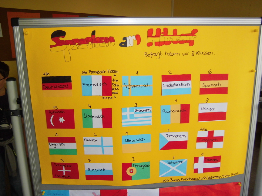 - Europa und seine Sprachen, Klasse 8a im Deutschunterricht. Verschiedene Sprachen wurden vorgestellt und eine besonders nette Idee war, dass auch die Zuschauer gefragt waren. Sie konnten an der Tafel ihr Wissen testen.