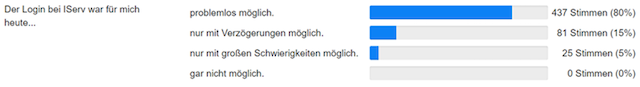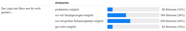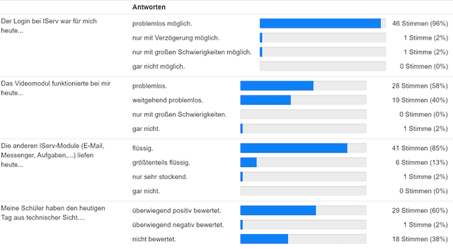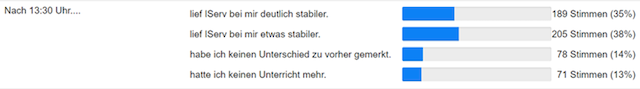 Das Hittorf und die 16 anderen Recklinghäuser IServ-Schulen konnten jedenfalls aufatmen. Die erneut verbesserten Server-Konfigurationen im Braunschweiger IServ-Rechenzentrum haben uns heute einen so problemlosen Einsatz ermöglicht, wie wir ihn bereits aus der Vorweihnachtszeit kannten. Dies spiegelt sich auch in den Ergebnissen der heutigen Schülerumfrage wider: