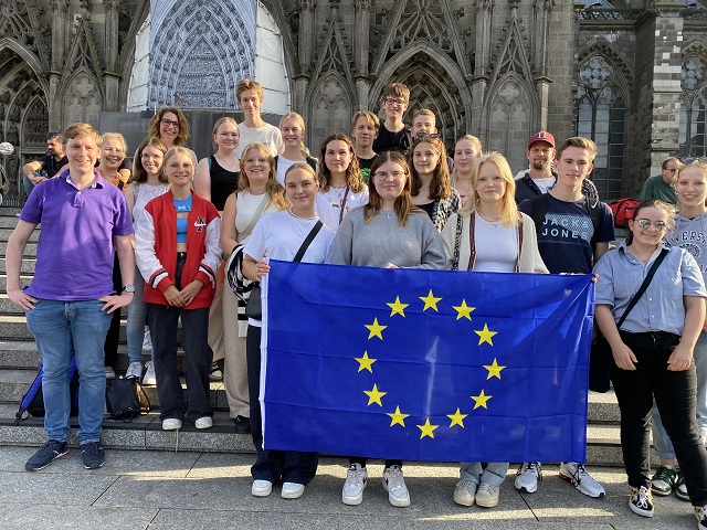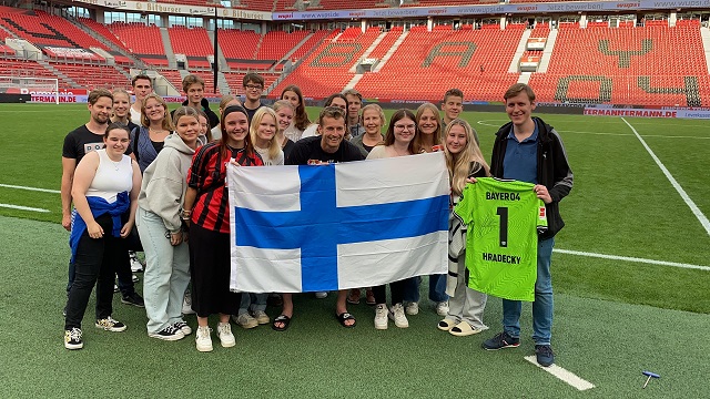 Neben der Projektarbeit haben die finnischen Gastschülerinnen und -schüler zusammen mit ihren Austauschpartnern das Ruhrgebiet bei bestem Wetter erkundet. So standen beispielsweise die Halde Hoheward, der Phoenixsee, das Bergbaumuseum und das Trainingsbergwerk in Recklinghausen auf dem Exkursionsprogramm. Neben diesen industriehistorischen Einblicken in unsere Region sind natürlich auch touristische Aspekte nicht zu kurz gekommen: Neben einer Turmbesteigung des Kölner Doms und einer Rheinfahrt wurde den nordeuropäischen Gästen auch unsere Fußballkultur präsentiert. Wir besuchten das Bundeligaspiel Bayer Leverkusen gegen SV Darmstadt. Bei Bayer Leverkusen spielt der finnische Nationaltorhüter Lukas Hradecky, mit dem es sogar nach dem Spiel noch ein kurzes persönliches Treffen an den Trainerbänken gab. Aber natürlich gehörte auch unsere traditionelle Currywurst und das Erlernen einiger finnischer Wörter zum Austausch dazu. Kiitos mahtavasta viikosta!