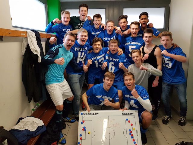 Auf diesen Titel hatten die diesjährigen Absolventen des Hittorfs lange gewartet. Denn als im vergangenen Jahr gegen das Berufskolleg Castrop-Rauxel eine knappe 0:2-Niederlage im Finale für etwas Enttäuschung gesorgt hatte, sagten schon damals die Abiturienten den talentierten Jungjahrgängen den Sieg 2018 voraus. Dass dies so kam, war aber im erneuten Aufeinandertreffen mit den Berufsschülern an der Sportanlage Maybacher Heide keine Selbstverständlichkeit. Die individuell sehr stark besetzten Castroper (u. A. mit dem ligahöchsten Spieler der A-Junioren Bundesliga) zeigten in der ersten Halbzeit, warum sie im vergangenen Jahr siegreich waren. Dennoch führte das Hittorf zur Pause, da es den starken Individualisten vom Berufskolleg eine taktisch disziplinierte Mannschaftsleistung entgegenzusetzen hatten. Eine tolle Kombination sorgte schon nach fünf Minuten für die Führung durch Paul Woitzik, die kurz vor der Halbzeit nach einem nicht weniger schönen „tödlichen Pass“ von Gourav Vasdev erhöht werden konnte.