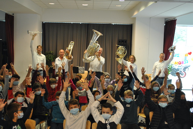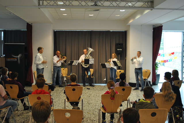 Björn Kjer (Trompete), Martin Wrede (Posaune), Thomas Tirler (Tuba), Sietske van Wieren (Horn) und Manfred Hof (Trompete) (auf dem ersten Foto von links) spielten den Klassen 5a bis 5d Filmmusik-Klassiker aus „Star Wars“, „Tom & Jerry“, „Fluch der Karibik“ und „Rocky“ sowie Highlights aus den Opern „Carmen“ und „Aida“ vor.