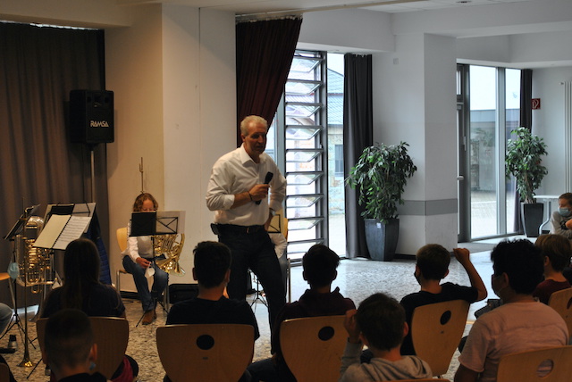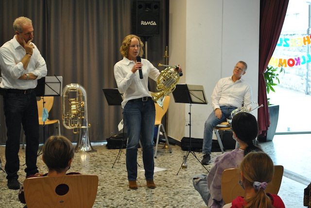 Außerdem erklärten die Musikerinnen und Musiker den Schülerinnen und Schülern die Instrumente und deren Spielweise und Besonderheiten ausführlich.