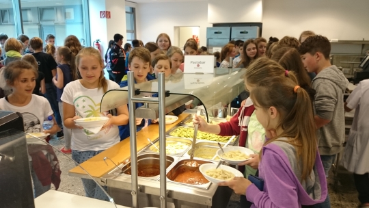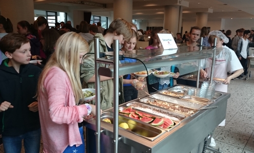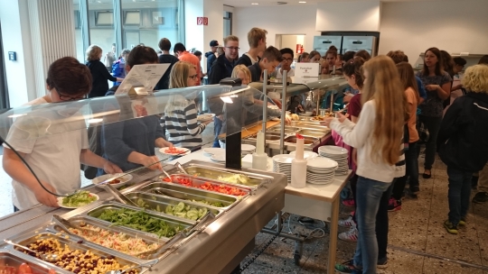 Die Grundidee ist, den Schülerinnen und Schülern nicht nur die Auswahl zwischen fertigen Gerichten zu geben, sondern ein vielfältiges und gesundes Buffet mit all you can eat-Regelung anzubieten. Dafür wird unsere Mensa zunächst provisorisch und nach der Testwoche auch dauerhaft so umgebaut, dass ein Buffetbereich mit Salatbar, Nudel- und Pizzatheke, Tagesgericht und Nachspeisenangebot entsteht, für den man einmalig 3,85€ mit Karte (bzw. 4,00€ bar) Eintritt bezahlt. Der Wiedereintritt ist kostenlos.