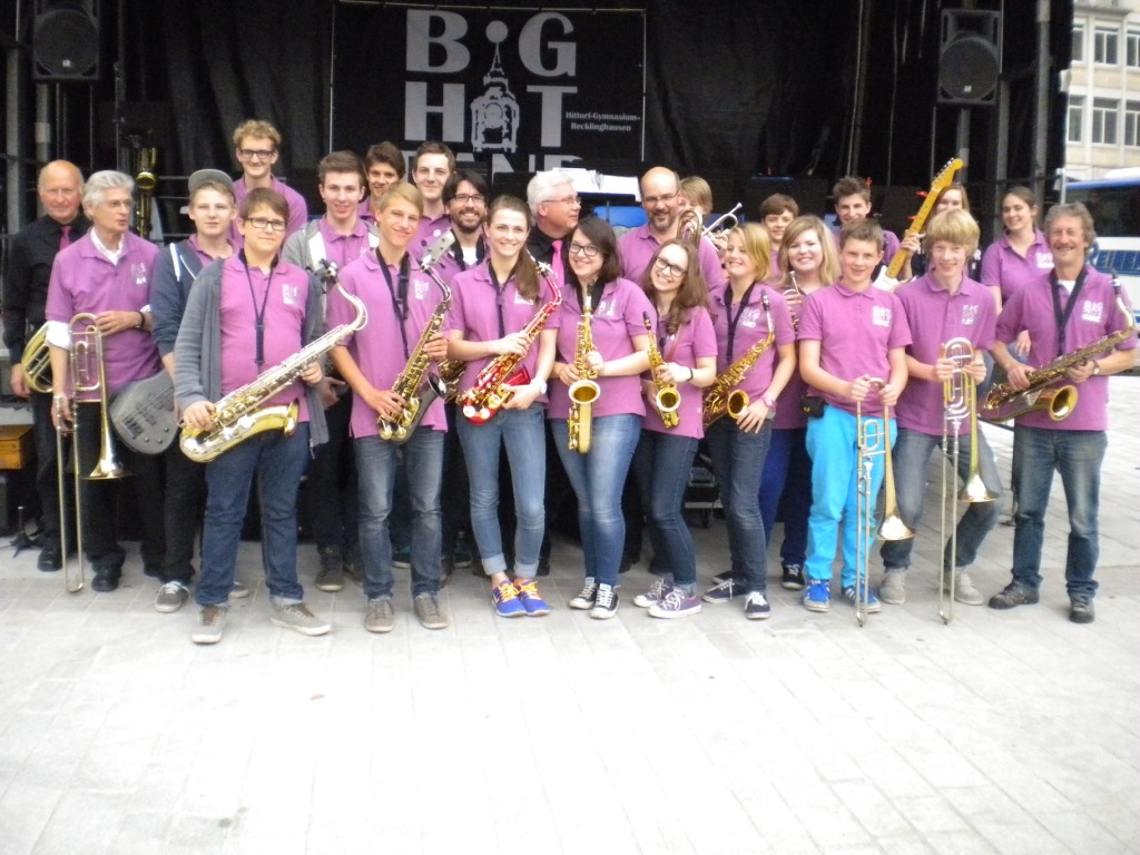 Eigentlich hätten die Pflasterarbeiten auf dem neu gestalteten Platz von Douai längst abgeschlossen sein sollen, doch das anhaltend schlechte Wetter der letzten Monate hatte den Planern einen Strich durch die Rechnung gemacht. So wurde es ein Wettkampf mit der Zeit, denn am letzten Freitag pünktlich um 17 Uhr sollte die BIG HIT BAND des Hittorf-Gymnasiums als Vorhut der Recklinghäuser Delegation den Startschuss zum alljährlichen „Fest der Riesen“ („Fête des Géants“) geben, bei dem auf dem Höhepunkt am Sonntag beim traditionellen Umzug die bis zu 8 Meter hohen Riesen-Figuren durch die Stadt getragen werden. Als gegen 16.30 Uhr der Soundcheck der Band im Lärm der Rüttel- und Kehrmaschinen, der Radlader und LKW unterging, befürchteten die jungen Musiker um Bandleader Stephan Hortebusch bereits das Schlimmste, doch die Kulturbeauftragte der Stadt Douai, Madame Delecambre, beruhigte alle: „Die Bauarbeiter haben mir heute morgen versprochen, dass sie es rechtzeitig schaffen.“ Und tatsächlich, um punkt 17 Uhr machte der Krach fast nahtlos dem Wohlklang von „Georgia on my mind“ Platz, dem ersten Stück der Bigband. Waren zunächst nur ein paar Bauarbeiter die Zuhörer, so trauten sich nach und nach mehr Menschen auf den Platz zurück, den sie wochenlang nicht hatten betreten können, und lauschten den Klassikern des Jazz, Swing, Rock und Pop. Am Ende des einstündigen, sehr abwechslungsreichen Programms hatten die Jugendlichen und ihre Betreuer die Herzen der Zuhörer erobert und für eine gelungene Eröffnung des Festes der Riesen gesorgt.