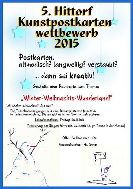 Bereits zum fünften Mal findet der Hittorf-Kunstpostkartenwettbewerb statt. Dieses Jahr lautet das Thema „Winter-Weihnachts-Wunderland“. Alle wichtigen Informationen könnt ihr dem Plakat entnehmen oder euch an Herrn Buder wenden.
