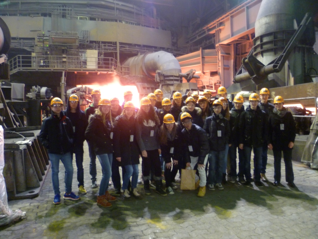 Am 20. März ’13 besuchte unser EF-Kurs Sozialwissenschaften (bilingual) das Konzerngelände von ThyssenKrupp Steel Europe in Duisburg. Die Schülerinnen und Schüler wurden zunächst in einem kurzen Vortrag eines Mitarbeiters über Ausbildungsmöglichkeiten und Berufschancen bei ThyssenKrupp informiert, um dann mit einem Bus zu einzelnen Stationen der Stahlverarbeitung auf dem 12 qkm großen Gelände gebracht zu werden. Dort erhielten sie Gelegenheit, einzelne Stationen der Produktionsprozesse zu sehen und live zu erleben.