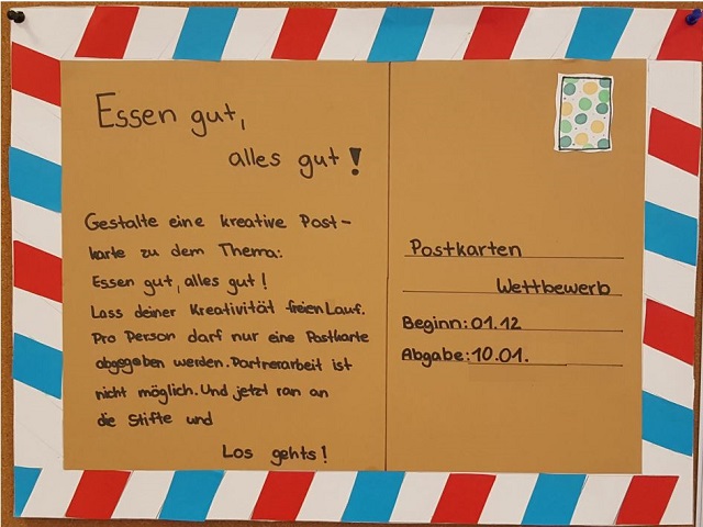 Der alljährliche Postkartenwettbewerb startet mit dem Thema "Essen gut, alles gut". Die Postkarten können ab sofort vor dem Sekretariat abgeholt und bis zum 10.01.2022 dort eingereicht werden. Pro Person darf nur eine Karte eingereicht werden, Partnerarbeit ist nicht möglich. Nachdem die Jury alle Postkarten eingesehen hat, werden ausgewählte Postkarten für den Tag der offenen Tür in den Druck gegeben. Bei Fragen könnt ihr euch gerne an die Kunstlehrer und -lehrerinnen wenden. Und jetzt: "Ran an die Stifte und los geht´s!"