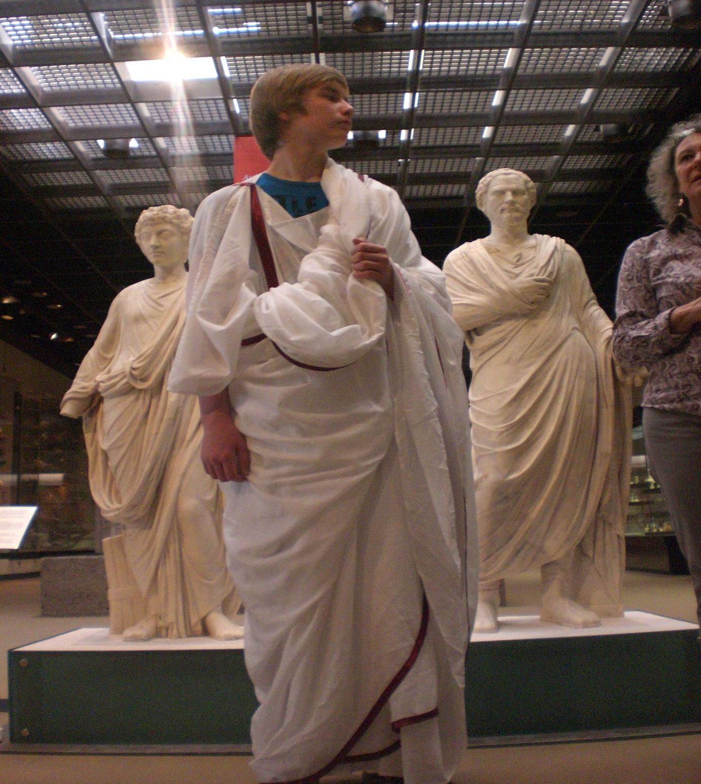 Wir, die Klassen 7d und 7e, haben das Römisch-Germanische Museum besucht und in einem Workshop vieles über die frühe Mode erfahren. Wir erfuhren, dass die Mode zwischen Mann und Frau kaum unterschiedlich war. Manche Togas (langer Umhang) waren sogar bis zu 8 Meter lang ! Auf dem Bild sieht man einen Schüler aus der 7d, er trägt eine ca. 6 Meter lange weiße Toga. Im Hintergrund sieht man zwei Statuen, sie tragen auch Togas.