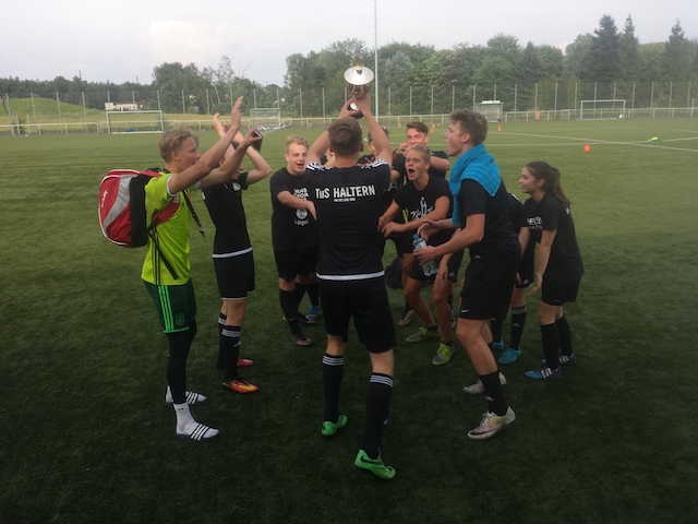 Das 3. Hittorfer Kleinfeldturnier Fußball war mal wieder ein voller Erfolg. Zwölf Mannschaften, zahlreiche Zuschauer und vielleicht noch mehr Spannung sorgten bei bestem Wetter für eine tolle Stimmung auf und neben dem Platz. Vor allem die vielen Abiturienten freuten sich merklich, mit ihren früheren Mitschülern und Lehrern um den begehrten Titel zu kämpfen. Eine fast schon tragische Rolle nahm dabei die „Thekentruppe“ ein. Auch nach Änderung ihres Namens holten die Ehemaligen bereits zum dritten Mal in Folge den zweiten Platz und mussten trotz toller Leistung wieder einmal zusehen, wie andere sich mit dem Wanderpokal feiern ließen. Dies waren 2017 die Thüringer Klöße, die mit einigen Schulmannschafts-Fußballern der Q1 für ein packendes Finale sorgten. Am Ende brachte ein Strafstoß eine Minute vor Ende der regulären Spielzeit die Entscheidung. Den dritten Platz sicherte sich etwas überraschend THE AVENGERS. Im Viertelfinale nutzten sie gegen die LehrerSportGemeinschaft ihre einzige Torchance für den Ausgleich, kamen mit einer tollen defensiven Mannschaftsleistung ins Neunmeterschießen und entschieden dieses auf dramatische Weise für sich. Auch das Spiel um Platz 3 gewannen sie im Neunmeterschießen gegen den FC Ramzanpour, deren Namensgeberin das gesamte Turnier gebannt verfolgt hatte. Auch wenn am Ende nicht alle Mannschaften ihre Erwartungen erfüllen konnten, war die Freude über das gemeinsame Erlebnis am Ende doch größer als die Enttäuschung über Fehlschüsse und verpasste Titelträume. Neben der Verpflegung durch die Chile-Fahrer und engagierten Schiedsrichterleistungen sorgten auch immer wieder die Cheerleader für die besondere Turnieratmosphäre und erhielten für ihre mutigen Auftritte verdienten Applaus. Den vorletzten Freitag im Schuljahr 2017/18 werden also bereits jetzt viele Schüler und Lehrer in ihren Kalender eintragen und sich mit Trainingseinheiten, Taktikbesprechungen oder auch selbst gestalteten Trikots wie in diesem Jahr der FC Ekmekspor auf die vierte Auflage vorbereiten.