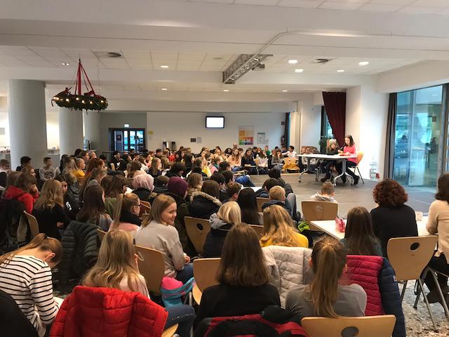 Auch in diesem Jahr fand wieder der Vorlesewettbewerb am Hittorf-Gymnasium statt. Am 5. Dezember zogen Merle Hausmann (6a), Matilda Ickenroth (6b), Lea Wildschütz (6c), Charlotte Korte (6d) und Marietta Bucic (6e) ihre ZuhörerInnen mit ihren Vorlesekünsten in ihren Bann und nahmen uns mit in verschiedene Welten. Sie hatten sich zuvor als Siegerinnen ihrer jeweiligen Klassen qualifiziert und durften nun ihr Vorlesetalent auf der Bühne in der Mensa unter Beweis stellen. Hierzu gehört eine ordentliche Portion Mut, da sie ihr Können vor rund 140 MitschülerInnen der Jahrgangsstufe 6, deren LehrerInnen sowie einer vierköpfigen Jury beweisen mussten. In der ersten Runde wurde eine etwa dreiminütige selbst ausgewählte Textstelle vorgestellt und die ZuhörerInnen bekamen eine Mischung aus lustigen, spannenden und gefühlvollen Textstellen präsentiert. In der anschließenden zweiten Runde wurden die Teilnehmerinnen mit einer ihnen unbekannten Textstelle konfrontiert. Diese stammte aus dem Buch „Es ist ein Elch entsprungen“ von Andreas Steinhöfel.