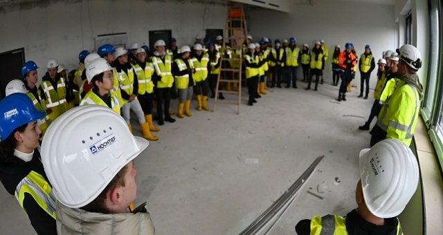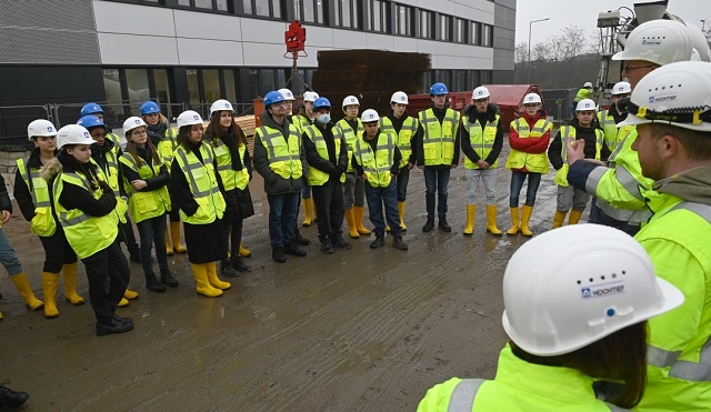 So begaben sie sich im Rahmen des Projekts „Dialog mit der Jugend“ der Stiftung TalentMetropole und des Initiativkreises Ruhrgebiet mit dem Bus auf den Weg nach Duisburg. Dort wurden sie von Vertretern des international agierenden Bauunternehmens HOCHTIEF AG und der Organisation des Initiativkreises Ruhrgebiet in Empfang genommen, um sich dort eine Großbaustelle anzuschauen.