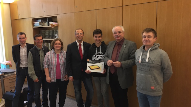 Bei der Ehrung gratulierten ihm die beiden Schulleiter Detlef Klee und Dr. Michael Jentsch, die beiden Stellvertreter Michael Rembiak und Christian Passerah (nicht im Bild, sondern hinter der Kamera) sowie die verantwortlichen Lehrkräfte Andreas Güntner, Miriam Steinke und Marcus Lobert. „Mach etwas Interessantes damit“, riet Herr Klee Tobias bei der Übergabe des Preises. Und auf dem Fußweg zurück vom Petrinum hatte Tobias auch schon die ersten Ideen für eine Teilnahme am Technikpreis des VDE. Einzelheiten werden noch nicht verraten, aber Tobias macht sehr gerne Sport und „an der Schnittstelle zwischen Sport, Technik und Informatik gibt es jede Menge interessante Projekte“, so Techniklehrer Marcus Lobert.