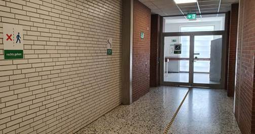 Durch ein dezente, eindeutige und rutschhemmende Mittelmarkierung unterstützen wir alle Schüler und Lehrer bei der Umsetzung dieser Regeln in den engen Gängen des Neubaus. Absperrungen mit Warnbaken o.ä., wie Sie sie eventuell aus anderen Schulen in den Medien gesehen haben, wird es am Hittorf aber nicht geben. Nach Einschätzung der Schulleitung widersprechen sie nicht nur dem Flucht- und Brandschutzerfordernissen, sondern auch dem Entwicklungsstand und der Reife der bei uns beschulten Kinder und Jugendlichen.