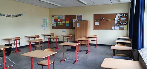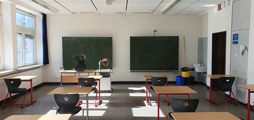 Im Neubau werden die Räume 101, 103, 105, 106, 107 sowie 201, 203, 205, 206, 207 für unterrichtliche Zwecke verwendet. Alle Räume wurden von uns mit 16 Schülereinzeltischen so eingerichtet, dass der aus Infektionsschutzerwägungen notwendige Mindestabstand von 1,50 Metern übertroffen wird: