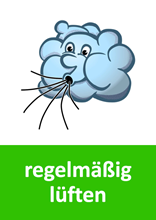 In den 30-minütigen Pausen (und ggf. auch zwischendurch) ist es trotz der weiten Sitzabstände wichtig, ausreichend zu lüften. Das hat vor allem mit der sog. Aerosolbildung zu tun. Aerosole sind feinste, ggf. auch mit Viren belastete Wassertröpfchen, die sich mit der Zeit in der Luft geschlossener Räume anreichern können, da sie aufgrund des sehr geringen Gewichts nur äußerst langsam zu Boden sinken. Wir erinnern Lehrer und Schüler gleichermaßen an das Lüften, indem wir in allen zehn Räumen dieses Schild ausgehängt haben: