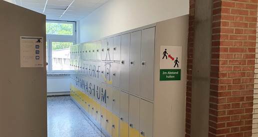 Der Neubau ist von 08:00 bis 14:30 Uhr geöffnet und auch alle Unterrichtsräume sind dann bereits zugänglich. Um Gruppenbildung zu vermeiden, gehen alle Schüler nach und nach über das vordere Treppenhaus und die Gänge zu ihren Räumen. Zu den Pausen und nach Unterrichtsschluss wird das Gebäude nach und nach wieder über das hintere Treppenhaus verlassen. Beim Betreten eines Raumes setzt man sich an denjenigen freien Tisch, der am weitesten von der Tür entfernt ist. So füllt sich der Raum in Richtung Tür. Nach Unterrichtsschluss wird er in umgekehrter Reihenfolge wieder verlassen, d.h. die in Türnähe Sitzenden gehen zuerst.