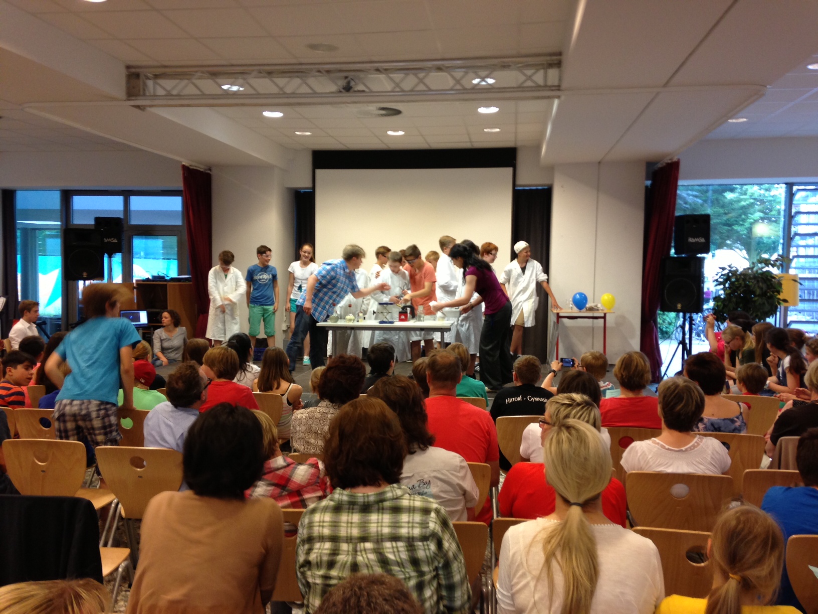 Beim Präsentationsabend der Neigungsfächer beeindruckten die Schülerinnen und Schüler der Neigungsfächer, der Band der Stufe 6 sowie der Tanzgruppe des Pausensports mit vielfältigen Präsentationen bzw. tollen Ausstellungen. Die jungen Hittorferinnen und Hittorfer führten u.a. kleine Theaterstücke mit z.T. sehr aufwändigem Bühnenbild und Requisiten auf, demonstrierten, wie man die Welt mit den Augen der Mathematik sehen kann, untertitelten witzige Kurzfilme mit französischem Text und sorgten mit Überraschungen aus dem Bereich der Chemie wie falschem Blut, Geheimtinte oder feuerballartig explodierenden Luftballons für Staunen und Bewunderung bei den zahlreich erschienenen Gästen. Für Begeisterung sorgten die Mädchen der Tanzgruppe unter der Leitung von Lorena Göritz und Lina Schonebeck mit ihrem Dance-Mashup sowie die Band „Black Apple“ mit Songs wie „Pflaster“.