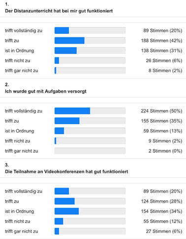 Begleitend zum Distanzlernen der letzten Woche hatten Herr Lobert und Herr Erwig eine kurze Umfrage unter allen Schülerinnen und Schülern gestartet. Die (bisherigen) Ergebnisse zeigen, denke ich, dass die Konzepte greifen und Lernen auf Distanz am Hittorf-Gymnasium ordentlich funktioniert: