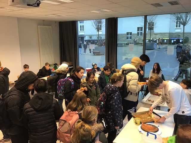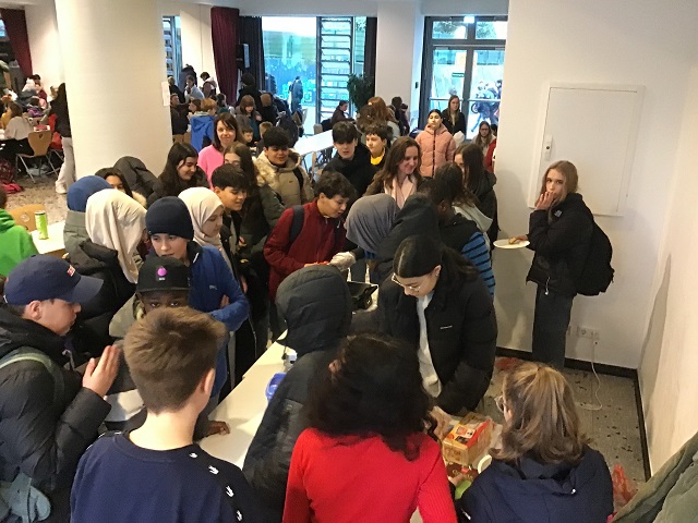Die SV verkaufte in den Tagen zuvor Kuchen und Waffeln in den Pausen und auch die Lehrerinnen und Lehrer unterstützten den Verkauf durch zusätzliche Kuchenspenden. Schlussendlich kamen insgesamt 1.400 Euro für die Opfer des Erdbebens in der Türkei und in Syrien zusammen.