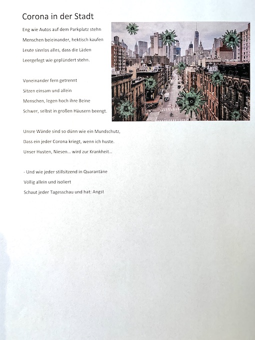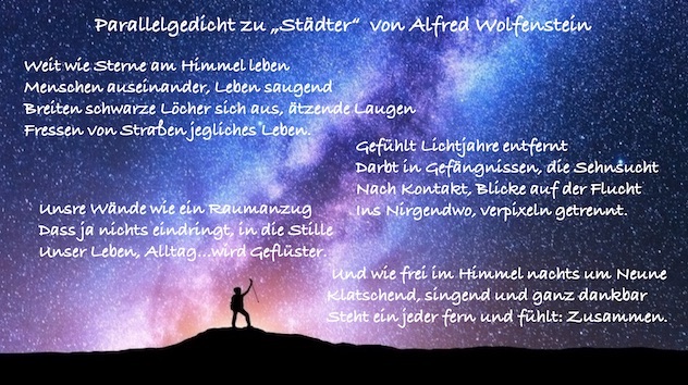 Die aktuelle Corona-Krise verändert den Alltag von uns allen. Kein Kontakt, keine Schule, weder Theater noch Kino. Der große Lockdown bewirkt auch, dass wir unsere Städte und die Menschen darin ganz anders erleben. Diese neue Wahrnehmung mit der Sicht der Großstadtlyriker zu Beginn des Großstadtlebens am Anfang des 20. Jahrhunderts zu vergleichen, erschien uns eine reizvolle Aufgabe.