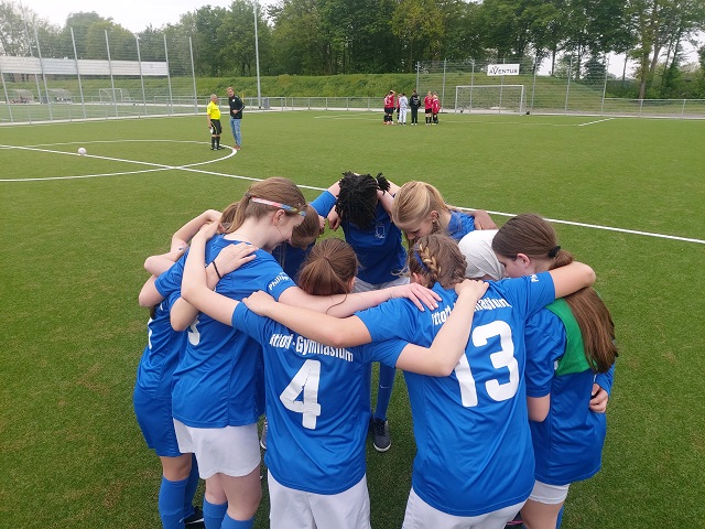 Ein toller Erfolg war der erstmalige Einzug der Mädchen in die Finalrunde auf Bezirksebene. Diese fand diesmal in Warendorf statt, weshalb die Abfahrt mit dem Bus noch vor Schulbeginn war. Die Musik der mitgereisten Mädchen der WK II aus Datteln machten schon die Hinfahrt zu einem Erlebnis. Auf dem Platz merkte man dann allerdings schnell, mit welch spielstarken Gegnerinnen wir es zu tun hatten. Im ersten Spiel konnten unsere Mädels das Spiel in der ersten Halbzeit noch ausgeglichen gestalten, mussten am Ende aber eine deutliche Niederlage einstecken. Im zweiten Spiel gelang dann das erste Tor, doch auch hier war das Gymnasium aus Münster stärker. Besonders war aber, dass diese das erste Gegentor überhaupt in diesem Jahr kassiert hatten. Im letzten Spiel stand es zur Pause gegen Coesfeld 1:1, doch auch der zweite Freistoßtreffer vom Hittorf reichte leider nicht zum Sieg. So stand am Ende ein toller Tag für die zehn Hittorferinnen, der ihnen gezeigt hat, welch verbindende Wirkung der Fußball hat und was man erreichen kann, wenn als Gruppe zusammenhält. Dass die Siegermannschaft aus Münster allesamt Vereinspielerinnen hatte und es beim Hittorf nur drei waren, verdeutlichte die Unterschiede. Für unsere Mädchen stand daher fest, dass sie mehr trainieren wollen. Und auf der Rückfahrt überwog schnell die Freude über ein außergewöhnliches Erlebnis.