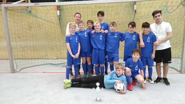 Am Ende wurde der 3. Platz ausgiebig gefeiert. Nach der letzten Parade von Torwart Christian Müller sprangen seine Mitspieler jubelnd in seinen Arm. Mehr als die üblichen fünf Schützen wurden benötigt für die Entscheidung um den begehrten Pokal. Ganz anders war die Stimmung allerdings vor dem Spiel gewesen, da sich unsere Mannschaft als Gruppenzweiter nur fürs kleine Finale qualifizierte. Nach zwei souveränen Siegen gegen die Overbergschule und die Gesamtschule Suderwich waren sich viele Zuschauer sicher, dass der Turniersieger Hittorf-Gymnasium heißen müsste. Auch im Spiel gegen die Bonhoeffer-Realschule gab es zahlreiche Chancen für einen Sieg, selbst ein Unentschieden hätte gereicht. Doch der Ball wollte nicht ins Tor, und wie so oft reichte dem Gegner kaum mehr als eine Torchance, um mit 1:0 ins Finale einzuziehen. Wie im Vorjahr scheiterte unsere Mannschaft an der Verwertung ihrer Torchancen, sodass das äußerst faire und spannende Turnier erneut vom Ausrichter, der Wolfgang-Borchert-Gesamtschule, gewonnen wurde. Für eine souveräne Leitung des Turniers sorgten dabei die Nachwuchstrainer vom Hittorf (Melih Özcan, Emre Aydar und Kjell Gralla), die als Schiedsrichter und Organisatoren für einen reibungslosen Ablauf sorgten.