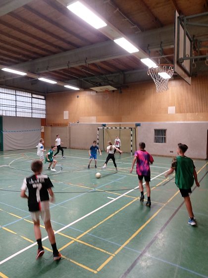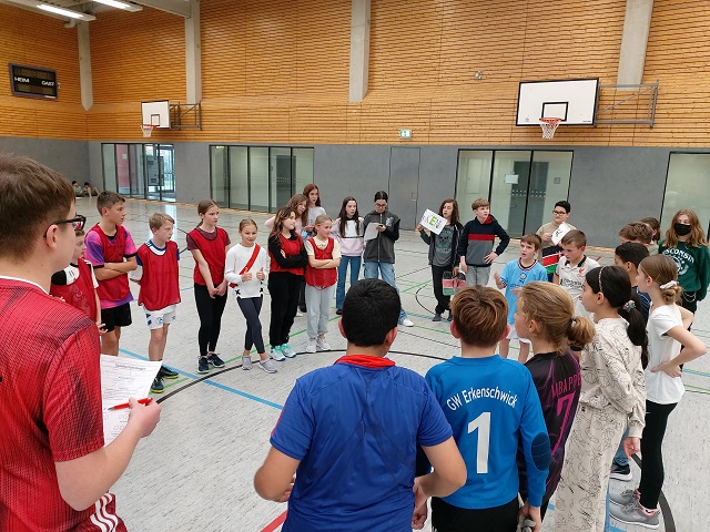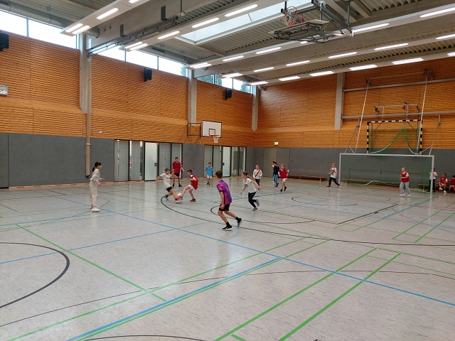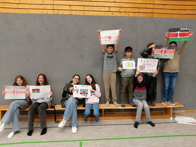 Eine weitere Besonderheit besteht darin, dass nicht die "richtigen" Mannschaften der Fußball-WM teilnehmen, sondern die jeweiligen Partnerländer von KICKFAIR, der Straßenfußballorganisation, mit der das Hittorf seit vielen Jahren zusammenarbeitet. So trafen im 5. Jahrgang Paraguay, Brasilien, Indien und Israel/Palästina aufeinander, bei den 6ern die Vertreter von Ruanda, Kolumbien, Kenia und Kambodscha. Während der dreiwöchigen Turnierphase sollen sich die jeweiligen Klassen auch intensiv mit ihren Ländern sowie der jeweiligen Partnerorganisation auseinandersetzen. So sah man schon Fahnen, selbst gestaltete T-Shirts oder farbenfrohe Plakate, mit denen die Klassen angefeuert wurden. Es bleibt abzuwarten, welche Klasse sich diesmal den Wanderpokal erspielt - durch tolle Kombinationen und sehenswerte Tore, aber auch starken Klassenzusammenhalt und faires Verhalten.