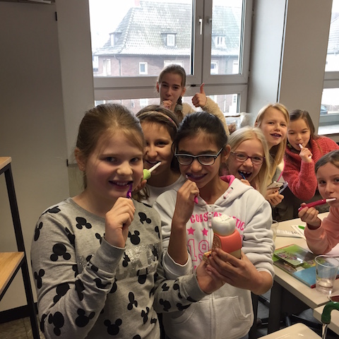 Im Rahmen des Biologieunterrichtes und der Gesundheitserziehung am Hittorf-Gymnasium lernten die Schülerinnen und Schüler der Klasse 5d nicht nur den Aufbau und die Funktion ihrer Zähne kennen, sondern halfen sich beim gemeinsamen Putzen, ihre Zahnpflege zu perfektionieren.