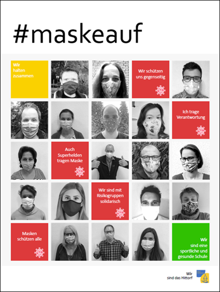 - Ansonsten gilt nach wie vor eine Maskenpflicht für alle Personen auf dem gesamten Schulgelände incl. aller Gänge, Treppen, Sanitärräume, Umkleiden, Lehrer- oder Verwaltungszimmer. Diese Maskenpflicht betrifft z.B. auch Eltern, Handwerker, Sekretariatskräfte und den Schulhausmeister.
