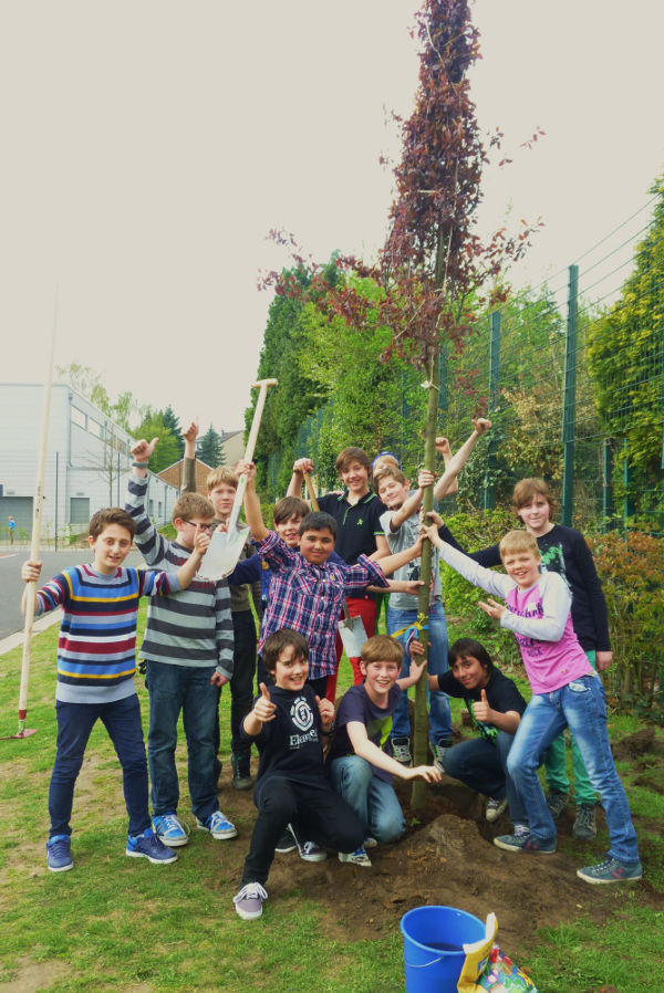 Die Jungen aus der Jahrgangsstufe 6 mussten zuerst den Rasen ausstechen, die Erde ausheben, Steine ausgraben und schließlich den Baum fach"männisch" in den Boden bringen. Damit der Baum auch gut angeht, ist an eine Baumpatenschaft gedacht, so dass die Schüler "ihren" Baum bei Bedarf mit Wasser versorgen.