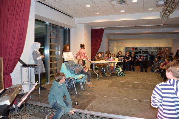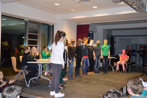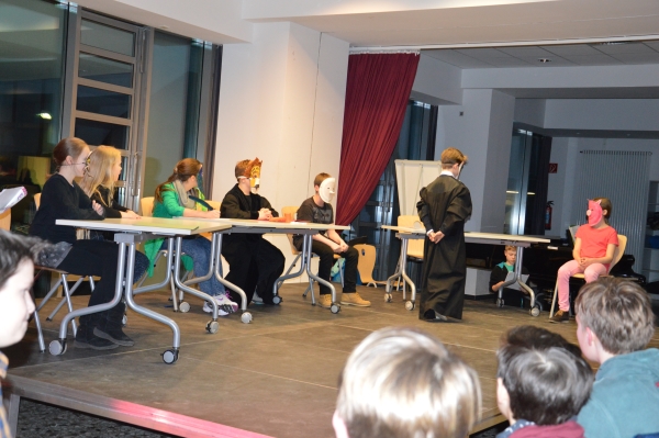 Auch am Tag darauf boten die Klassen 5c, 5d und 5e ein abwechslungsreiches Programm. Die Schülerinnen und Schüler unterhielten das Publikum mit dem Theaterstück Ein Mensch vor dem Gericht der Tiere, selbstverfassten englischen Dialogen und Klassenhits, einer Cheerleading-Choreographie sowie Stomp mit Bällen. Weitere musikalische Höhepunkte rundeten den Abend ab: So ernteten der Unterstufenchor und die 5er-Band viel Applaus für ihre ersten Auftritte in der Schulöffentlichkeit.